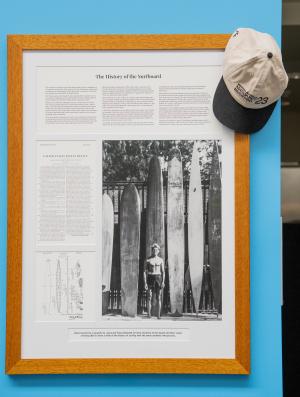 The 4.2m board features the revolutionary hollow design of legendary American athlete, inventor and writer Tom Blake which was patented in 1932. Before then boards were made from solid timber and could weigh 100kg or more.